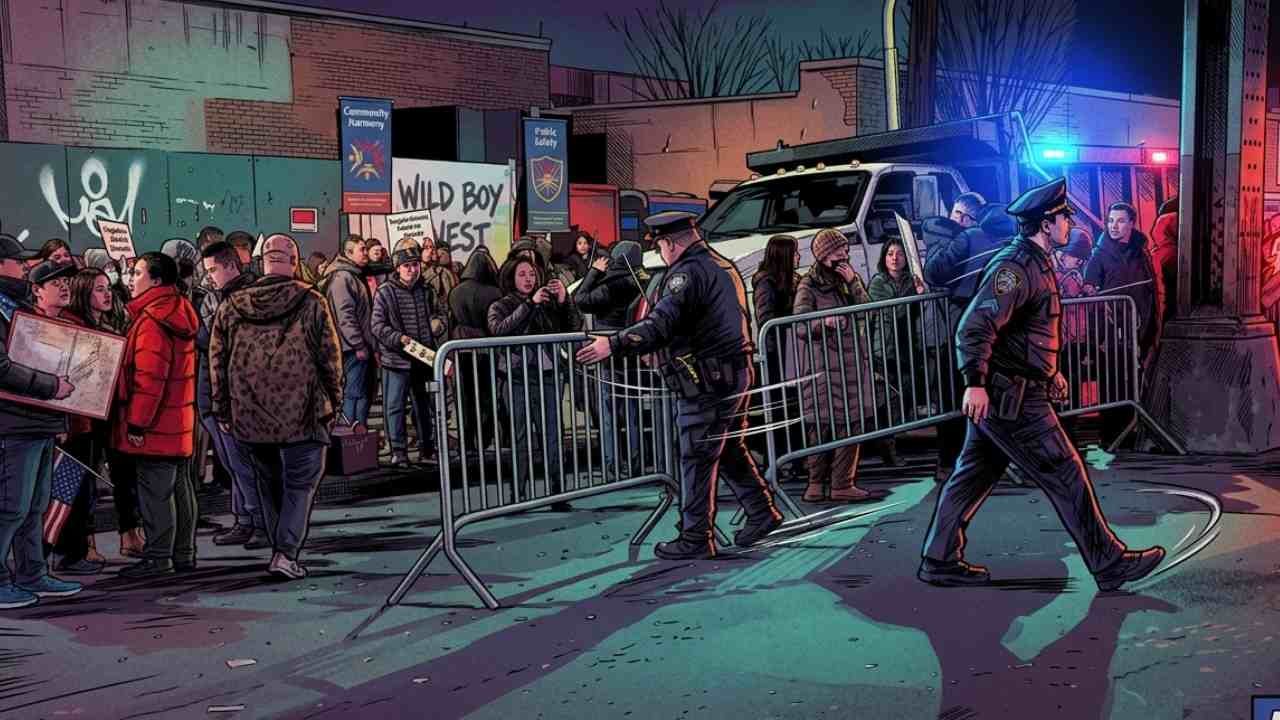 The protest began shortly after 9:30 p.m., following rumors that construction work could begin as early as the following day. Police were deployed to the area, and barricades were set up as crowds assembled, many waving American flags and holding signs opposing the project.
