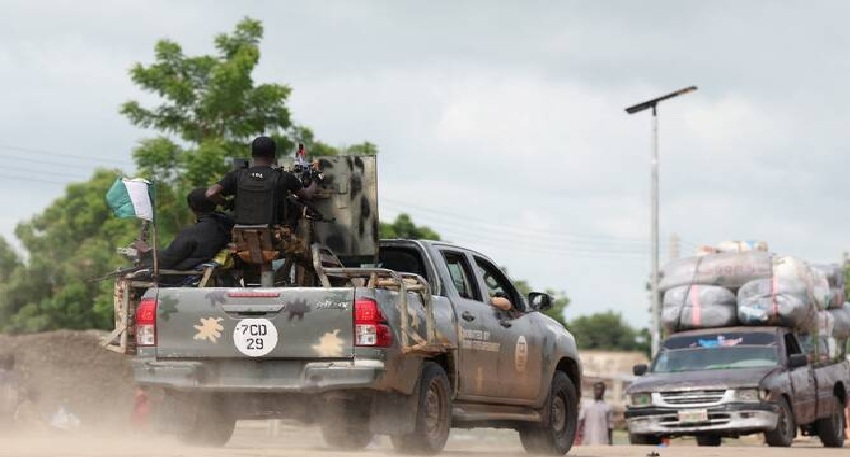 A Nigerian Army vehicle moves in the town of Dikwa during the dsitrubution of food aid to beneficiaries at a World Food Programme distribution centre in Dikwa, Borno State, Nigeria. Photo: Reuters
