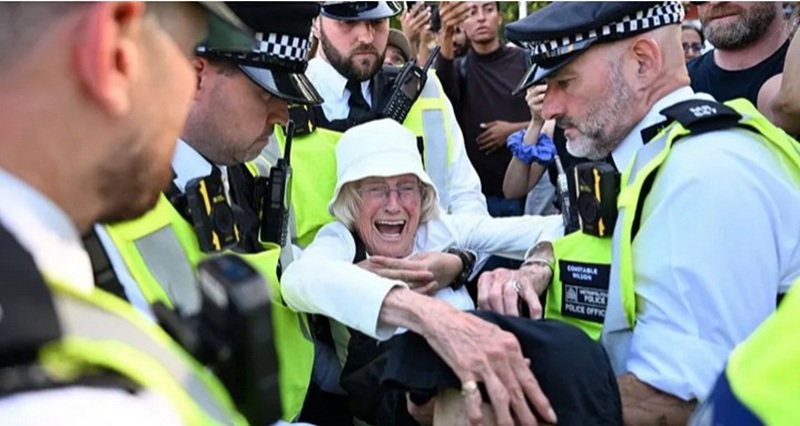 The Reuters video showed demonstrators who had gathered in Parliament Square by the Houses of Parliament being carried away by police. The crowd chanted “shame on you” at the police.