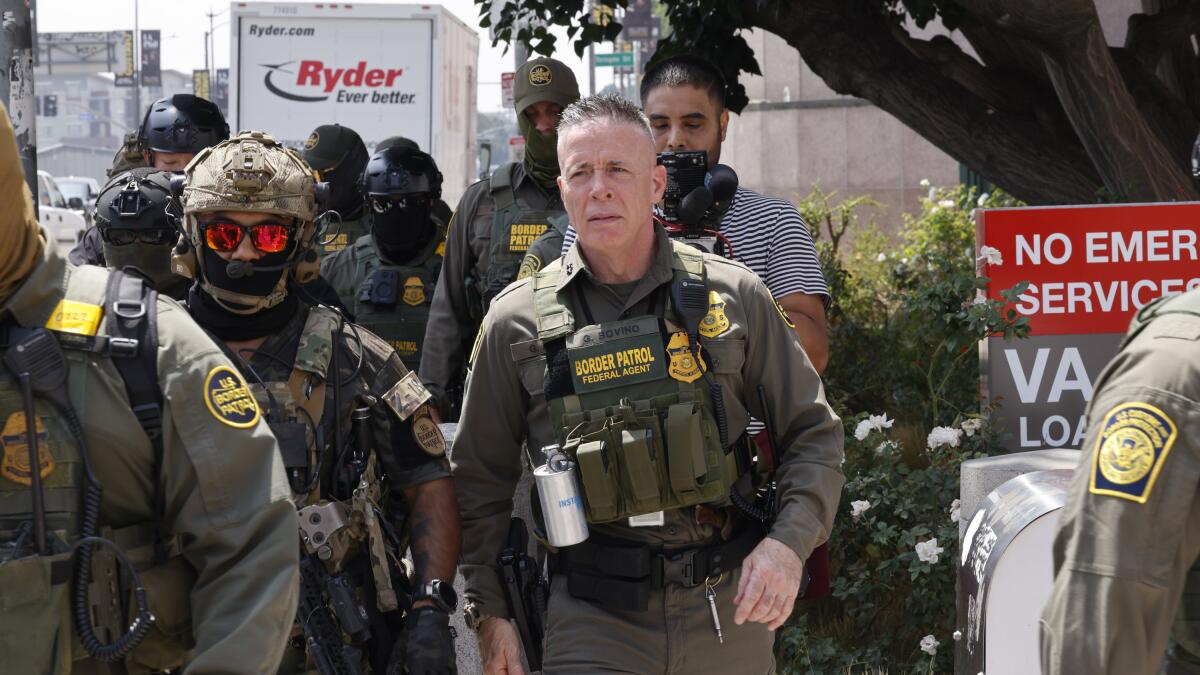 Los Angeles, CA - August 14: Gregory Bovino, Chief Patrol Agent of the El Centro Sector and Commander-Operation At Large CA (center), marches with federal agents to the Edward R. Roybal Federal Building after US Border Patrol agents produced a show of force outside the Japanese American National Museum where Gov. Newsom was holding a redistricting press conference on Thursday, Aug. 14, 2025 in Los Angeles, CA. (Carlin Stiehl / Los Angeles Times)
